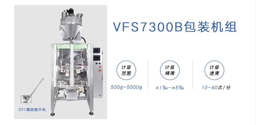 VFS7300B包裝機組,由螺旋提升機、VFS7300B立式充填包裝機、螺旋計量機組成,集計量、制袋、包裝、封口、打印、計數(shù)于一體。配有先進料位開關、可以增加安裝除靜電裝置并附除塵裝置,有效地解決粉塵自動包裝的難題??勺鍪至啻?、插角袋、枕式袋等多種袋型。