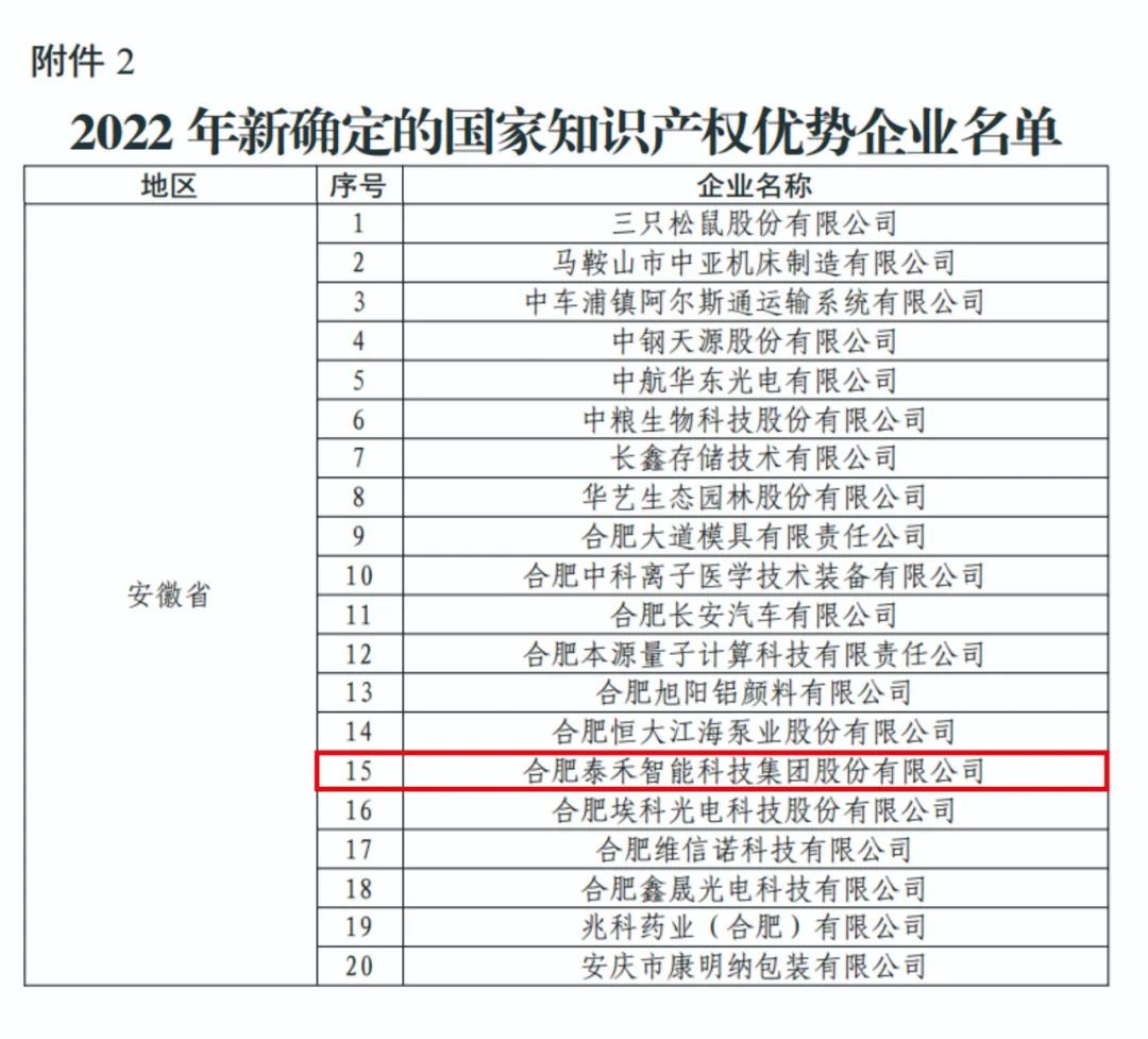 10月27日,國(guó)家知識(shí)產(chǎn)權(quán)局發(fā)布《關(guān)于確定2022年新一批及通過(guò)復(fù)核的國(guó)家知識(shí)產(chǎn)權(quán)示范企業(yè)和優(yōu)勢(shì)企業(yè)的通知》,合肥泰禾智能科技集團(tuán)股份有限公司被國(guó)家知識(shí)產(chǎn)權(quán)局認(rèn)定為國(guó)家知識(shí)產(chǎn)權(quán)優(yōu)勢(shì)企業(yè)。