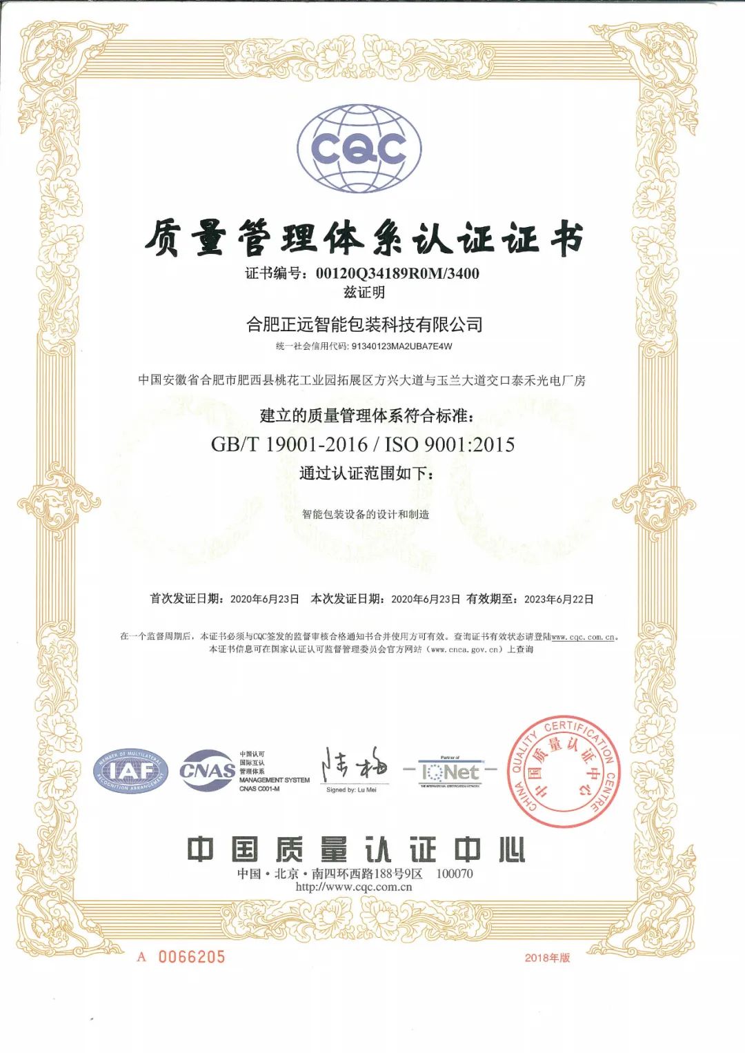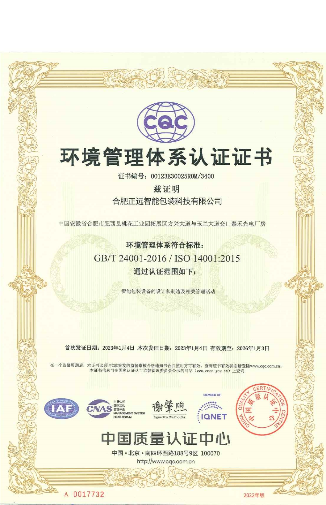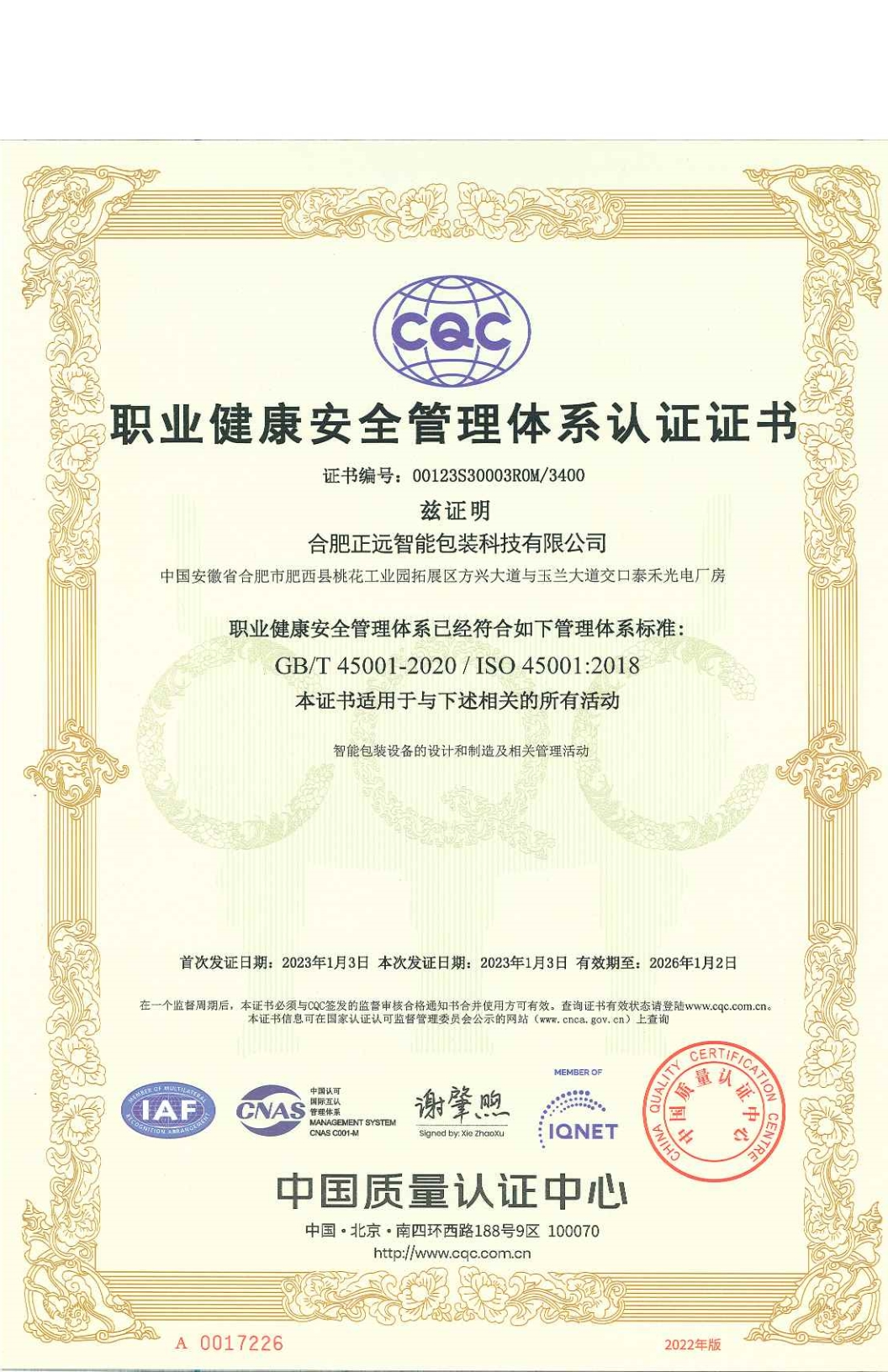 經(jīng)過(guò)嚴(yán)苛的檢驗(yàn)標(biāo)準(zhǔn)和認(rèn)證考察,2023年1月3日,合肥正遠(yuǎn)智能包裝科技有限公司繼獲得《ISO質(zhì)量管理體系認(rèn)證證書(shū)》之后,又一次性榮獲兩份重量級(jí)管理體系認(rèn)證證書(shū):《職業(yè)健康安全管理體系認(rèn)證證書(shū)》《環(huán)境管理體系認(rèn)證證書(shū)》,所獲證書(shū)詮釋了正遠(yuǎn)包裝在職業(yè)健康體系、環(huán)境管理體系、質(zhì)量管理體系三個(gè)領(lǐng)域所取得的巨大成就!