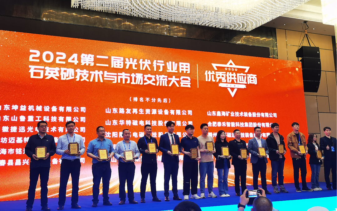 2024年3月29日,泰禾智能受邀參加第二屆光伏行業(yè)用石英砂技術(shù)與市場(chǎng)交流大會(huì),并榮獲“優(yōu)秀供應(yīng)商”大獎(jiǎng)。作為礦石分選領(lǐng)域的代表企業(yè),泰禾智能一直致力于石英砂尖端分選技術(shù)的開發(fā)和高端分選裝備的應(yīng)用推廣。