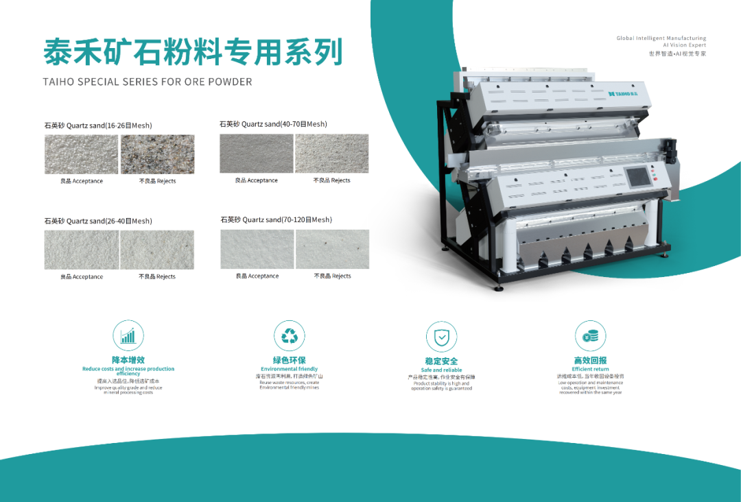 在光伏用石英砂的需求量穩(wěn)步增加的大背景下,我國(guó)目前卻面臨著石英坩堝內(nèi)層砂依賴進(jìn)口、光伏玻璃超白砂大規(guī)模供應(yīng)瓶頸等一系列卡脖子問(wèn)題。而泰禾智能深耕礦石分選領(lǐng)域多年,從技術(shù)和應(yīng)用端口極大地解決了石英砂原料物理提純的痛點(diǎn)難題。