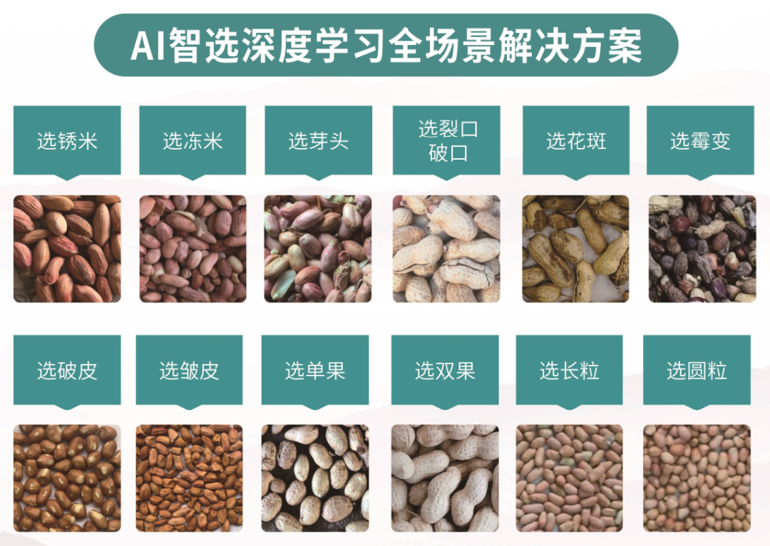泰禾AI智選深度學習色選機搭載AI深度學習系統(tǒng),產(chǎn)量大、精度高、損耗低??捎行Х诌x花生米中的長圓粒,剔除芽頭、大脫皮、小脫皮、霉變、黃銹、紫米、凍米等和其它雜質(zhì)(花生果、桿、土塊、石子等);同時,可針對花生果中的裂口、破口、花斑、黑癟果、黑頭、蟲蝕果、麻果、花生殼、單雙果進行精準高效的分級分選,實現(xiàn)優(yōu)品優(yōu)價。