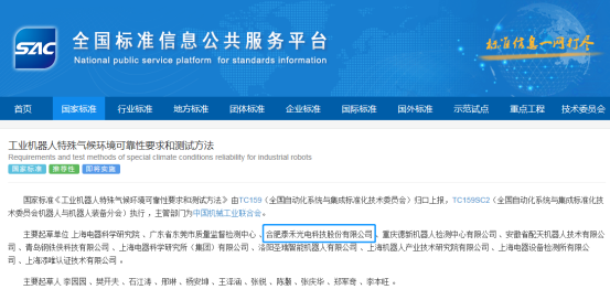 近日,經過網上公示、起草、征求意見、審查、批準,由合肥泰禾光電科技股份有限公司作為主要起草單位(排名前三)起草的國家標準《工業(yè)機器人特殊氣候環(huán)境可靠性要求和測試方法》(標準號:GB/T 39006-2020)于2020年9月29日正式發(fā)布,將于2021年4月1日實施。