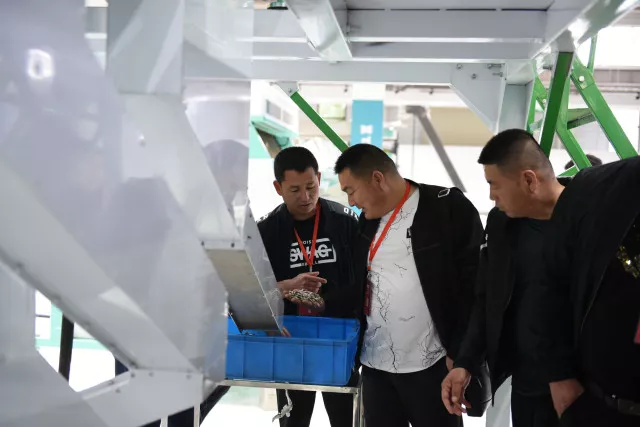 在泰禾光電相關(guān)領(lǐng)導(dǎo)陪同下,來(lái)自全國(guó)堅(jiān)果炒貨行業(yè)的精英們興致勃勃的參觀了泰禾光電自主研發(fā)生產(chǎn)的智能色選機(jī)、工業(yè)機(jī)器人和智能立體倉(cāng)儲(chǔ)系統(tǒng)等產(chǎn)品生產(chǎn)車(chē)間,并給予了高度評(píng)價(jià)。隨后來(lái)到泰禾光電產(chǎn)品展示區(qū),所展示的智華系列雜糧色選機(jī)、智睿系列色選機(jī)、雙層履帶機(jī)、一體化散料X光機(jī)等豐富產(chǎn)品,讓來(lái)自全國(guó)堅(jiān)果炒貨行業(yè)的精英們直觀地了解了泰禾光電的科技創(chuàng)新與實(shí)力,其中泰禾光電2018智華系列新品色選機(jī)得到來(lái)自全國(guó)堅(jiān)果炒貨行業(yè)的精英們的一致好評(píng)與肯定。