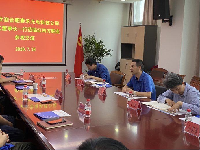 7月28日上午合肥泰禾光電科技股份有限公司(以下簡稱泰禾光電)董事長許大紅先生率管理團隊赴中鹽安徽紅四方肥業(yè)股份有限公司(以下簡稱中鹽紅四方肥業(yè))考察交流,隨行人員有泰禾光電副總經(jīng)理石江濤、子公司總經(jīng)理張浩、人力與資源中心總監(jiān)王忠軍、研發(fā)事業(yè)部智能裝車項目負責(zé)人張杰。