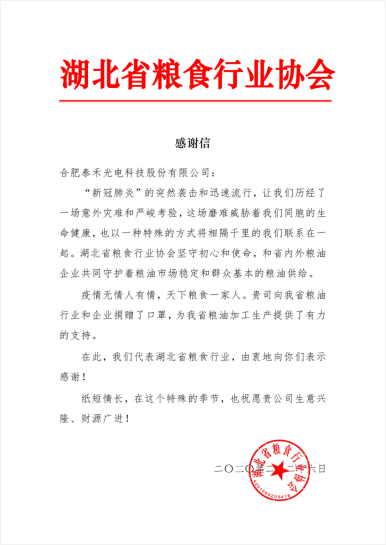 第一批捐贈(zèng)物資抵達(dá)后,湖北省糧食行業(yè)協(xié)會(huì)向泰禾光電發(fā)來感謝信,對(duì)泰禾光電向湖北省糧油行業(yè)和企業(yè)捐贈(zèng)口罩,助力湖北糧油加工生產(chǎn)提供支持,表示感謝。