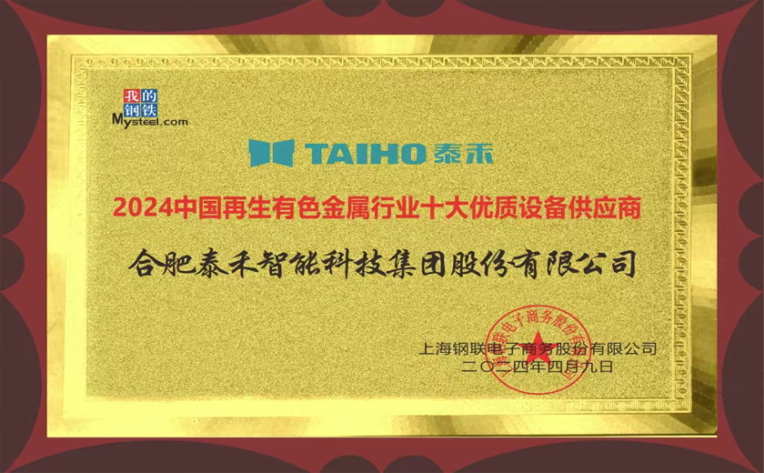 行業(yè)認(rèn)可 | 泰禾智能獲“2024中國(guó)再生有色金屬行業(yè)十大優(yōu)質(zhì)設(shè)備供應(yīng)商”殊榮